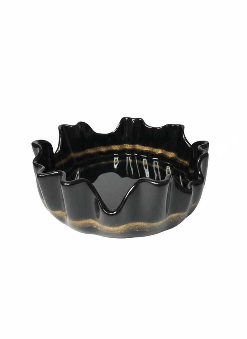 Breng stijl en originaliteit in huis met deze handgemaakte epoxy schaal van 19 cm. Het golvende rand, moderne design geeft een uniek accent aan elke ruimte; perfect als decoratief object, fruitschaal of opbergaccessoire. Iedere schaal wordt met de hand gegoten en afgewerkt voor een luxe en glanzend resultaat.