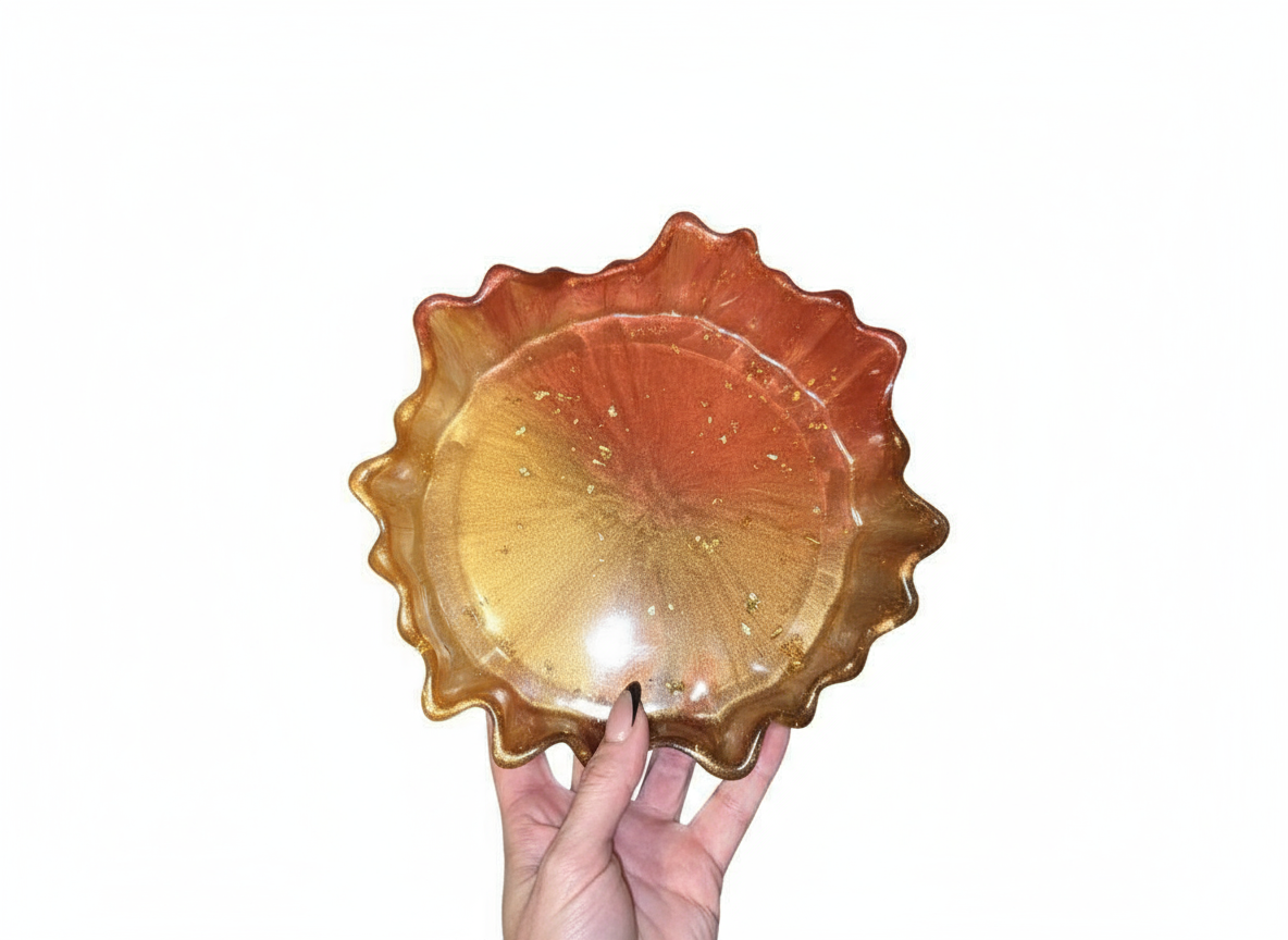 Ontdek deze unieke handgemaakte Goud, bruin, bordeaurood met een elegante golvende rand, afgewerkt met een prachtige gouden glitterflakes die het geheel een subtiele, luxueuze uitstraling geeft. Deze veelzijdige schaal met een doorsnede van ongeveer 19 cm is perfect als stijlvolle fruitschaal of als bijzondere bloempot voor kleine planten en succulenten. Een tijdloos en artistiek design dat moeiteloos sfeer en karakter toevoegt aan je interieur. Geef je woonruimte een exclusieve touch met dit bijzondere stukje vakmanschap.